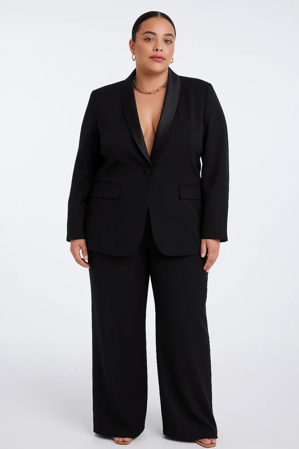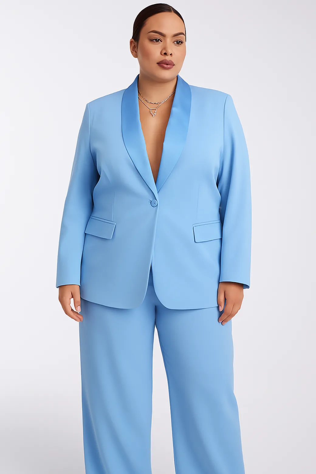 Tailleur femminile in tessuto satinato color celeste, composto da giacca monopetto con rever classico e pantalone palazzo a vita alta. La linea essenziale e il taglio sartoriale valorizzano la figura, donando eleganza e versatilità. Perfetto per cerimonie, eventi o look da ufficio con un tocco raffinato