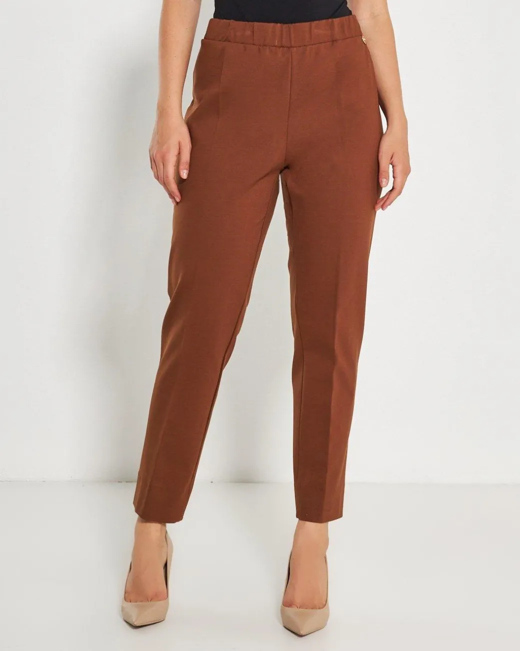 Pantalone gamba dritta con bustino elastico in vita; tessuto confortevole al tatto. Medaglietta logo cuore nella parte anteriore.